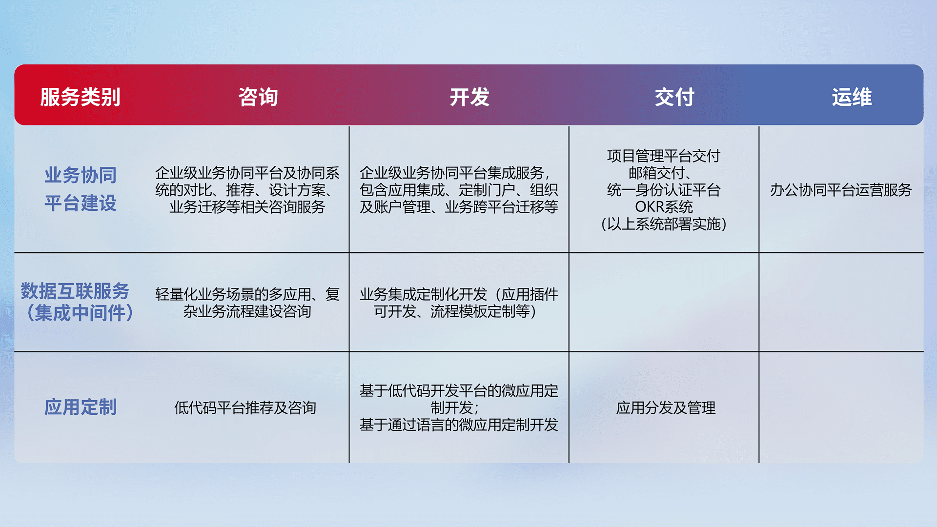 针对钉钉、、、、企微、、、、IDaas等平台级产品提供产品的规划、、方案、、、、交付、、、定制化开发等服务,,实现如统一协同办公、、、智能客户服务、、、混合会议管理、、、智能数据查询、、、等业务场景,,,实现数字化转型。。。